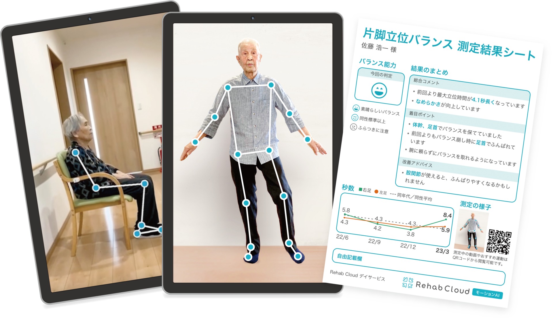 当日は、10名を超えるリハビリ専門職の知見が組み込まれた「モーションAI」を利用した身体機能の測定を実施します。