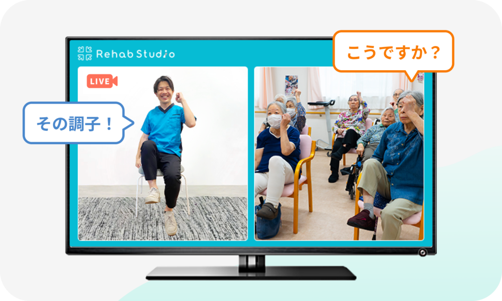 本イベントで使用する「Rehab studio」は、リハビリ専門職とオンラインで会話しながら取り組む集団リハビリ・体操を通じて、身体機能やQOLの改善・介護予防を支援するサービスです。